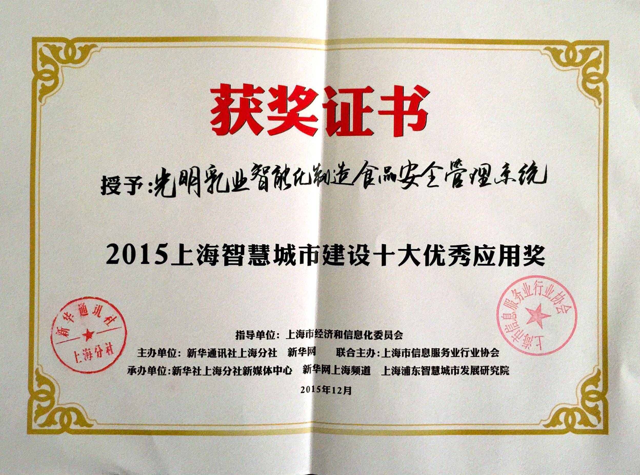 12月14日,2015“上海智慧城市建设优秀应用评选”各大奖项在沪揭晓:光明乳业的“智能化制造食品安全管理系统”荣获“十大优秀应用奖”。