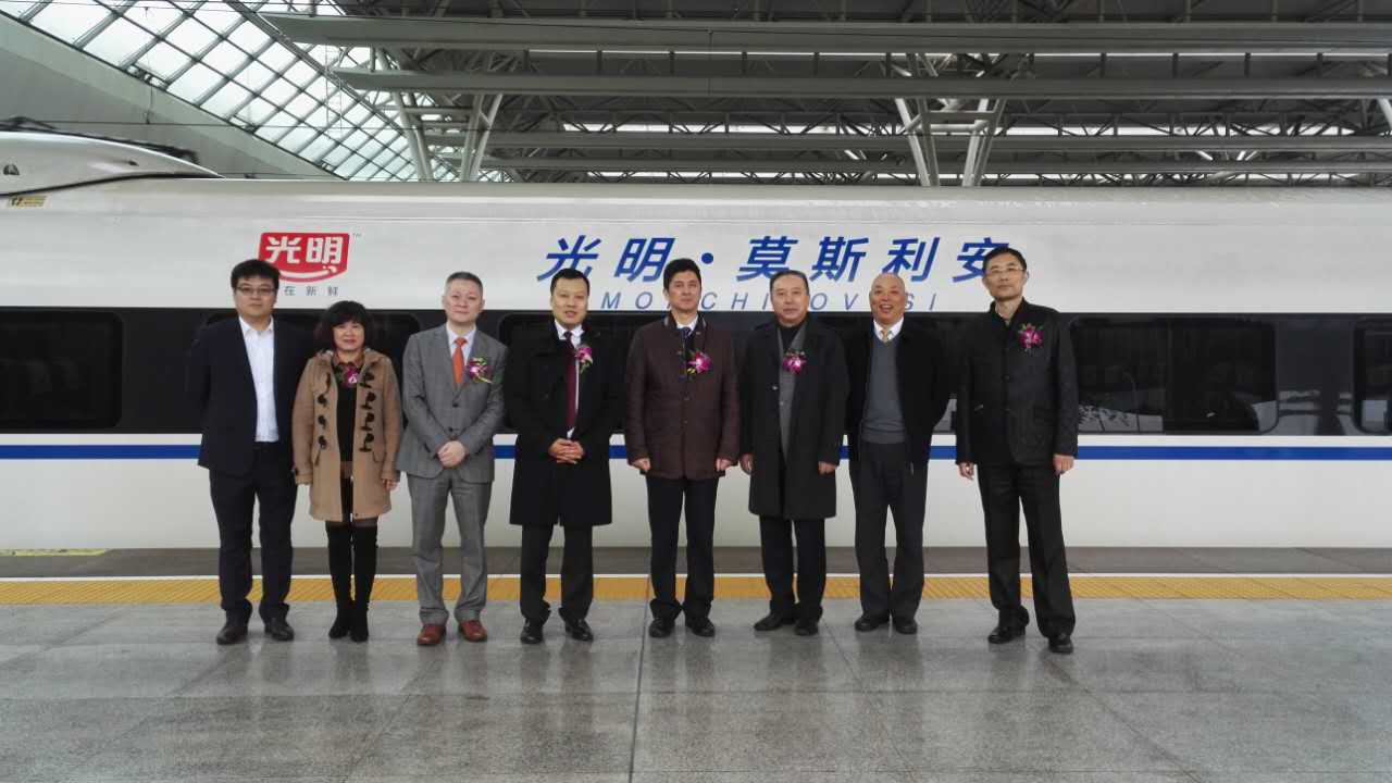 上午10点,光明乳业冠名的“光明莫斯利安”高铁品牌专列准时从上海虹桥站驶出前往北京。正式发车前,上海铁路文化广告发展有限公司副总经理沈鹏先生,光明乳业股份有限公司董事长张崇建等领导共同出席了“光明莫斯利安高铁”首发仪式并剪彩,正式宣布“光明莫斯利安”高铁品牌专列正式首发!