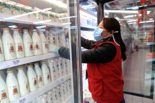 下午2点多,家乐福斜土路店的奶制品冷柜前,导购员郎中梅刚刚完成往货架上补完一次货,把框子收回库房去。她干这行已经十多年了,最近这几天是她从业以来最繁忙的。“今天光给货架补货就七八次,衣服背后流汗都湿了。”