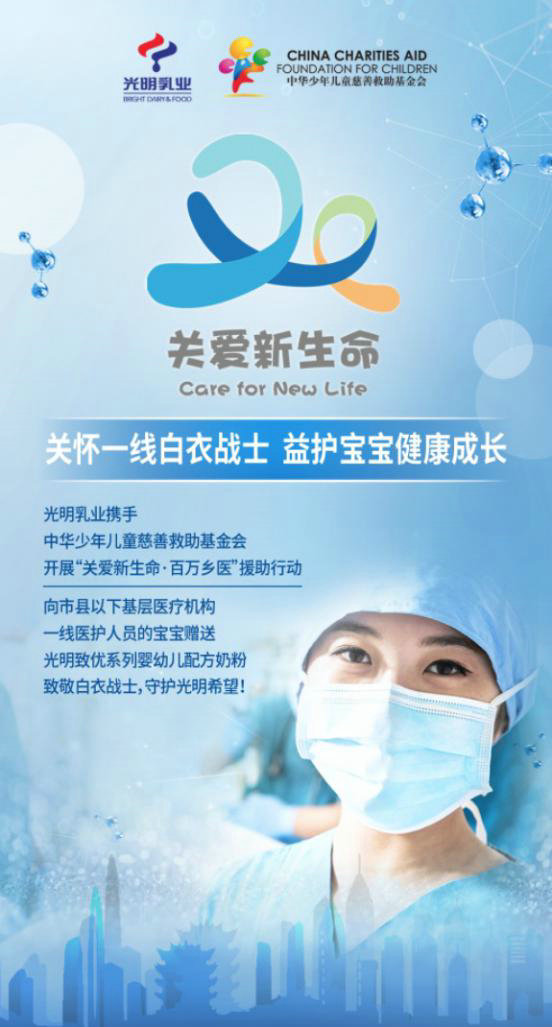 在“百万乡医”援助行动中,光明乳业携手中华少年儿童慈善救助基金会,关怀一线医护人员,向山东、河南、浙江等市县以下基层医疗卫生机构(人民医院、中医院、妇幼保健院、疾控中心、乡镇卫生院、社区卫生服务中心等)医护人员中有0-3岁婴幼儿的家庭,捐赠20202罐价值300余万元的光明致优系列婴幼儿配方奶粉,保障一线医护人员家中宝宝口粮的供应,守住美丽勇敢“白衣战士”们背后的家人。光明乳业与中华儿慈会共同关怀抗疫一线的“白衣战士”,助力宝宝们的健康成长。