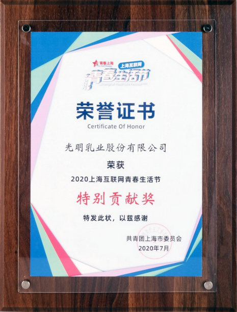 光明乳业荣获2020上海互联网青春生活节“特别贡献奖”