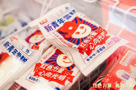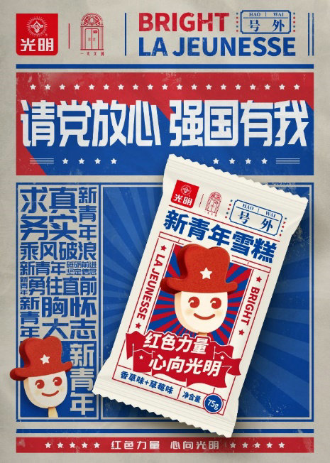 此次推出的戴上红色礼帽的“新青年雪糕”,原型是拥有数十年历史的光明奇形娃娃雪糕,将娃娃的咖啡色礼帽变成红色,正是对新青年精神的致敬。此外,光明冷饮更将对当代青年的寄望印在“新青年雪糕”棒签上,7句文案象征着光明冷饮走过的70年,更传递出新时代的7种新青年精神。“新青年雪糕”在其他细节上也倾注巧思,将原来的巧克力口味替换为草莓味,推出草莓味+香草味的娃娃雪糕,呈现了自身红色基因的同时,也给消费者带来新的舌尖享受。在包装上,为了让消费者更好地感受到新青年的时代氛围,特别以“新青年”期刊、大字报的排版风格,搭配五角星、红旗等图形元素,让现代与经典融汇交织,更为新青年精神注入新的时代力量。