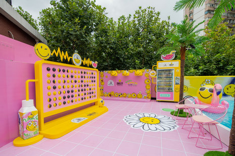 从延安西路远远望去,就能看到门店的玻璃外墙都布满了各式的表情包以及楼顶的微笑气球,与树荫、红墙融为一体,使原先传统的老洋房焕然一新,添加了一份俏皮与活力。走进店内,地上的贴纸、产品柜上的联名新品、打卡背景墙时刻都在传播着快乐。作为本次活动的重点“莫斯利安夏日微笑天台”则是在门店3楼露台。一步入天台就能看到夏日感十足的“泳池派对”。清新的地贴搭配游泳圈和各式的沙滩球,坐在一旁舒适的沙滩椅上,就会给人一种身临海滩的感觉。