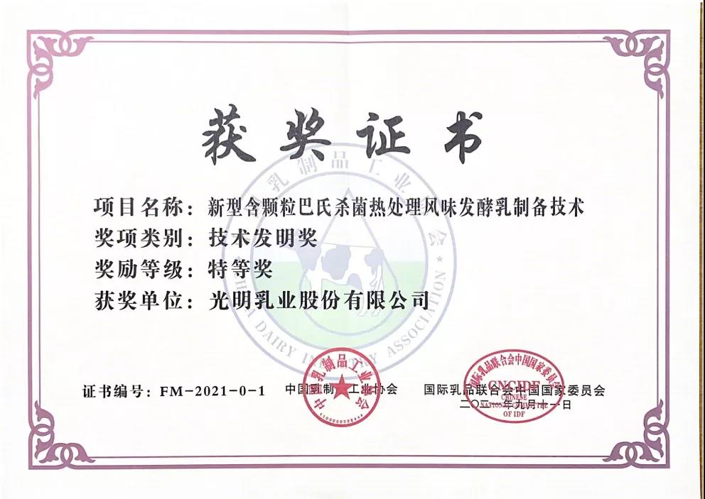 2021年9月11日,中国乳制品工业协会第二十七次年会在杭州召开,本次年会是由中国乳制品工业协会、国际乳品联合会中国国家委员会(CNCIDF)联合举办。中国乳制品工业协会组织评选了2021年度中国乳业科技系列奖项,其中的奖项包括技术发明奖和技术进步奖,并于第二十七届年会期间举办了颁奖仪式。在本次评选中,光明乳业参评项目《新型含颗粒巴氏杀菌热处理风味发酵乳制备技术》获得了技术发明特等奖。