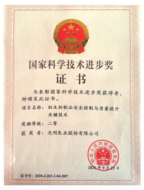 去年11月3日,在2020年度国家科学技术奖励大会上,由中国农业科学院北京畜牧兽医研究所牵头完成,光明乳业参与的“奶及奶制品安全控制与质量提升关键技术”获国家科学技术进步奖二等奖。这是光明乳业第五次在该大会上拿下的重要奖项,成为行业内荣获此至高荣誉最多的乳制品企业。在生产方面,光明乳业也在全国鲜奶市场获得了份额第一的好成绩,“光明优倍”成为全国第一个实现全国生产、全国销售的鲜奶品牌。光明乳业由此成为“技术引领—标准引领—品质引领”的国内乳企典范。