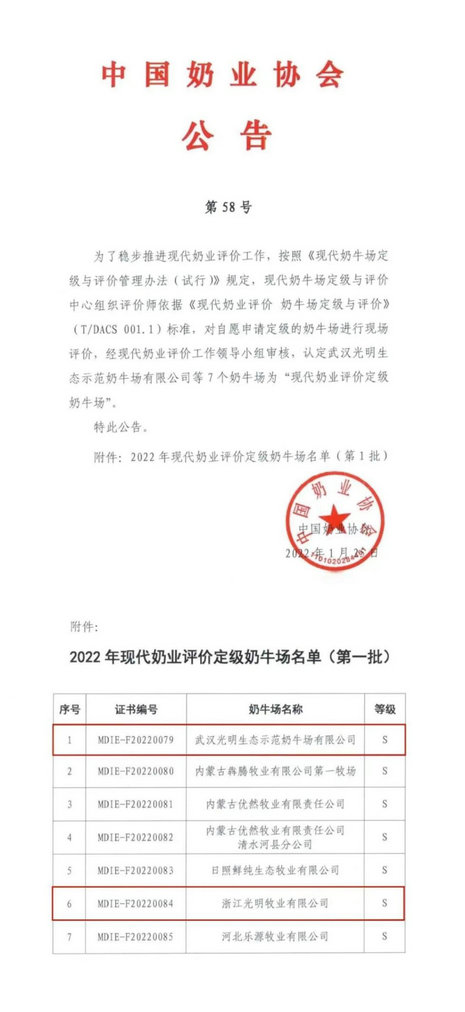 近日,中国奶业协会发布了2022年第一批现代奶业评价定级奶牛场名单。经现代奶业评价工作领导小组审核,认定光明牧业有限公司下属武汉光明生态示范奶牛场有限公司、浙江光明牧业有限公司为“现代奶业评价定级S级奶牛场”。