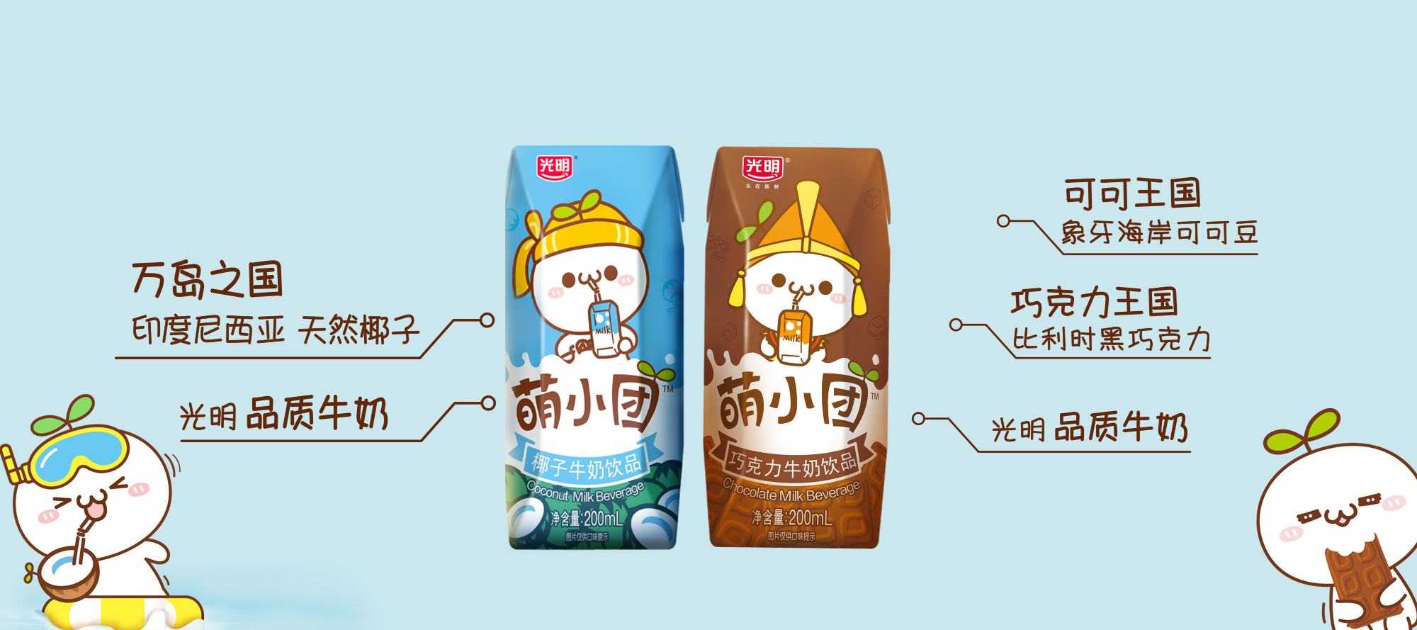 萌小团巧克力牛奶饮品,好喝美味,原料使用来自象牙海岸哥伦比亚的可可豆、比利时的黑巧克力及光明优质奶源等。